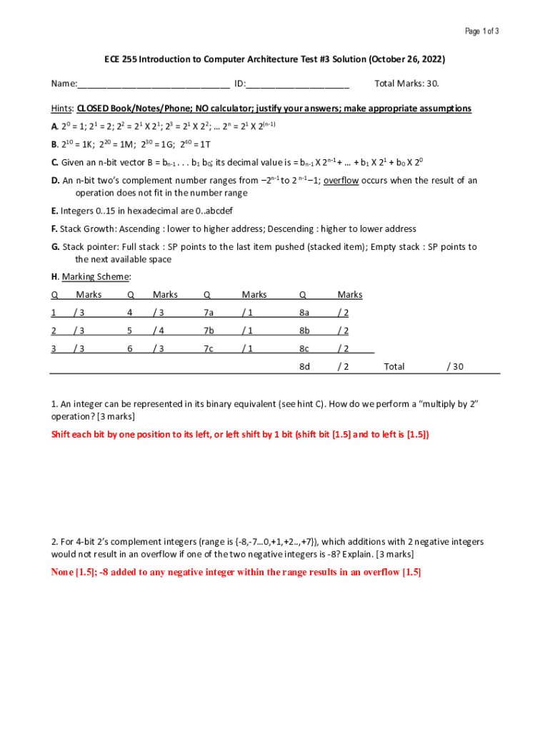 Page 1 of 3ECE 255 Introduction to Computer Architecture Test #3 Solution (October 26, 2022) Name:___ ID:___Total Marks: 30. Hints: CLOSED Book/Notes/Phone; NO calculator; justify your answers; make