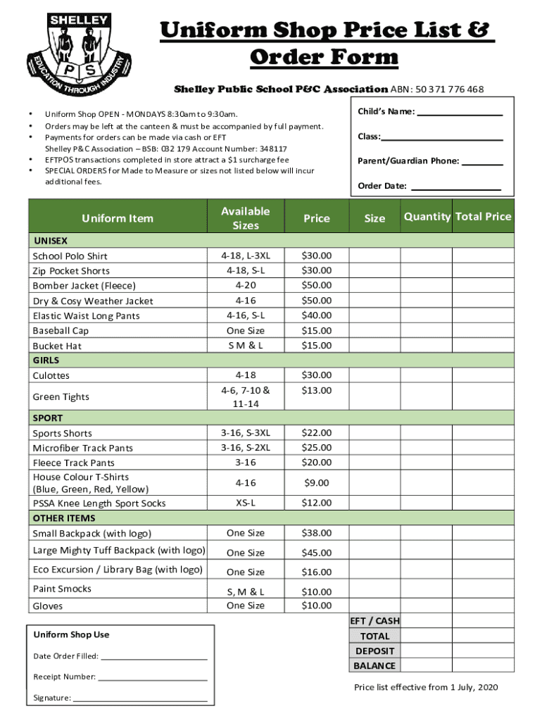 Uniform Shop Price List & Order Form Shelley Public School P&C Association ABN: 50 371 776 468 Uniform Shop OPEN MONDAYS 8:30am to 9:30am. Orders may be left at the canteen & must be accompanied by