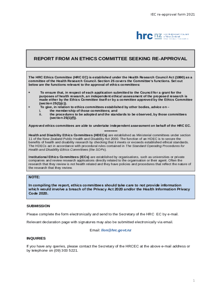 Template Report from an Ethics Committee Seeking Re-approval instructions