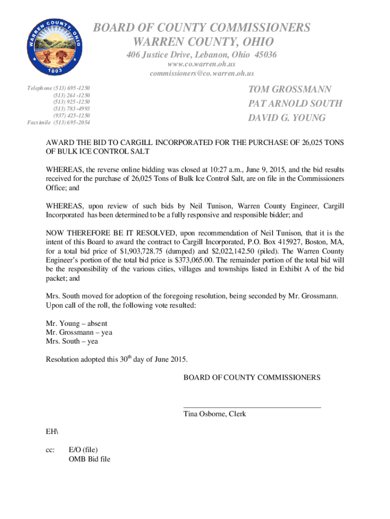 BOARD OF COUNTY COMMISSIONERS WARREN COUNTY, OHIO 406 Justice Drive, Lebanon, Ohio 45036 www.co.warren.oh.us commissioners. Warren.oh.custom GROSSMAN PAT ARNOLD SOUTH DAVID G. YOUNGTelephone (513)