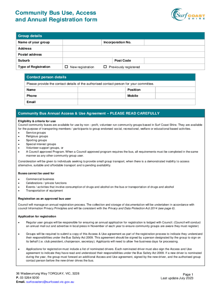 Community Bus Use, Access and Annual Registration form Group details Name of your groupIncorporation No. Address Postal address Suburb Type of Registration Post Code New registration Previously registeredContact