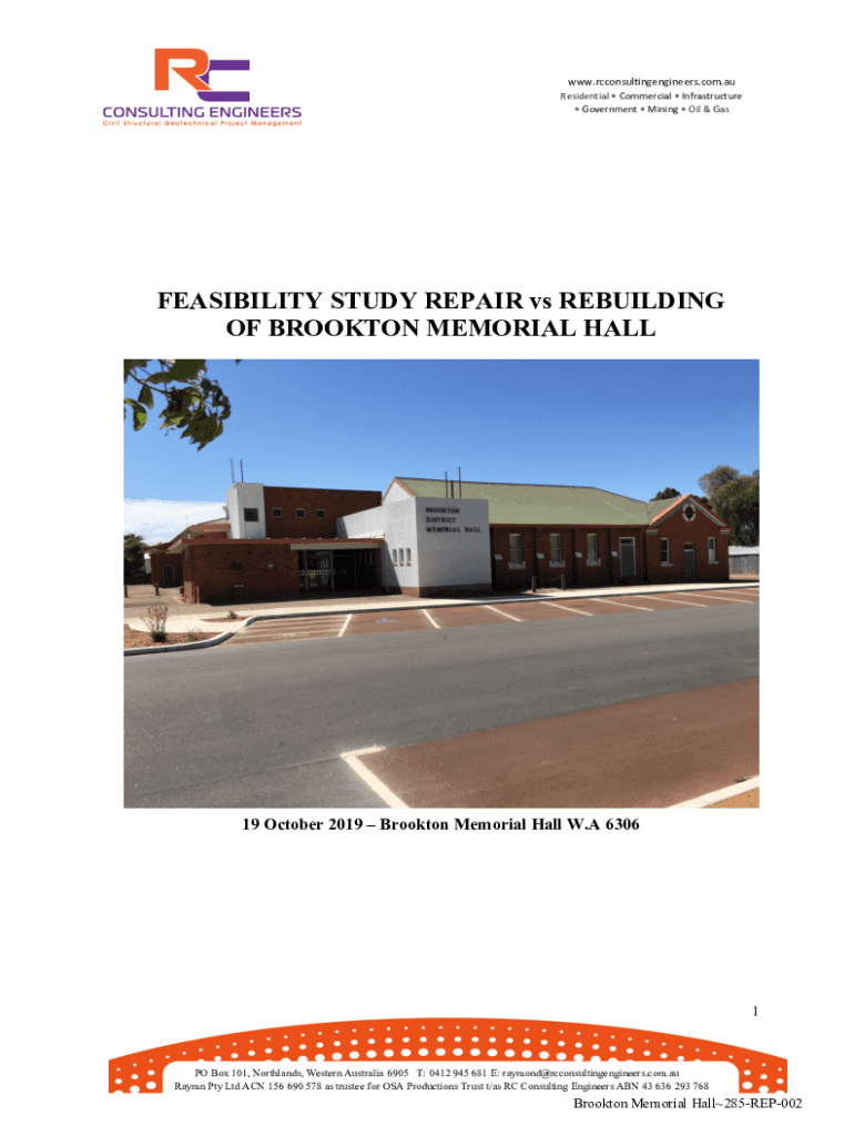 WWW.rcconsultingengineers.com.AU Residential * Commercial * Infrastructure * Government * Mining * Oil & Feasibility STUDY REPAIR vs REBUILDING OF BROCKTON MEMORIAL HALL19 October 2019 Brook ton Memorial