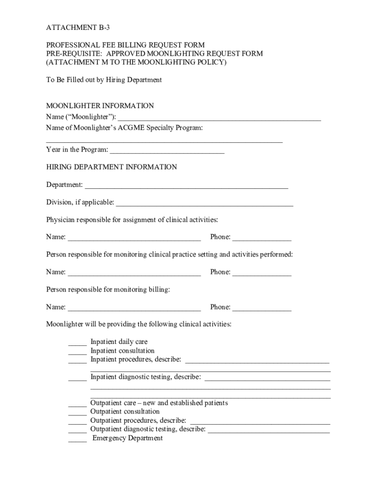 ATTACHMENT B3 PROFESSIONAL FEE BILLING REQUEST FORM PREREQUISITE: APPROVED MOONLIGHTING REQUEST FORM (ATTACHMENT M TO THE MOONLIGHTING POLICY) To Be Filled out by Hiring Department MOONLIGHTER INFORMATION