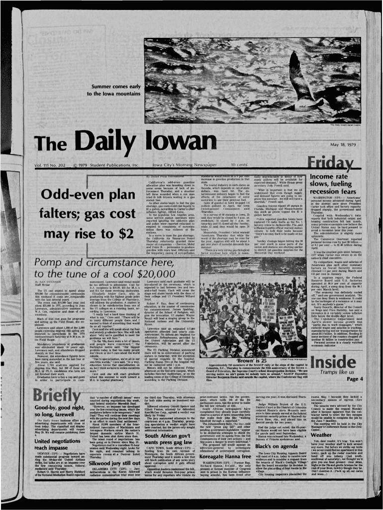 Summer comes early to the Iowa mountains able Vol. 111 No. 202May 18, 1979Iowa City\'s Morning Newspaper 1979 Student Publications, Inc. Ocean plan falters; gas cost California\'s odd even gasoline