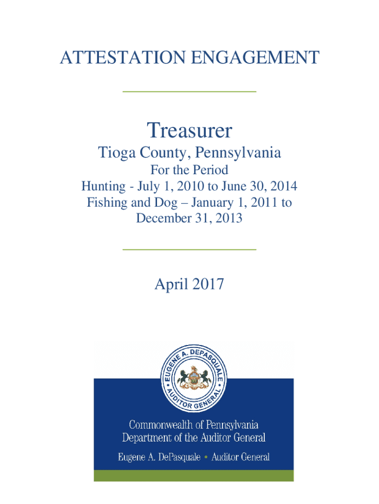 ATTESTATION ENGAGEMENT___ Treasurer Toga County, Pennsylvania For the Period Hunting July 1, 2010, to June 30, 2014, Fishing and Dog January 1, 2011, to December 31, 2013___ April 2017Independent