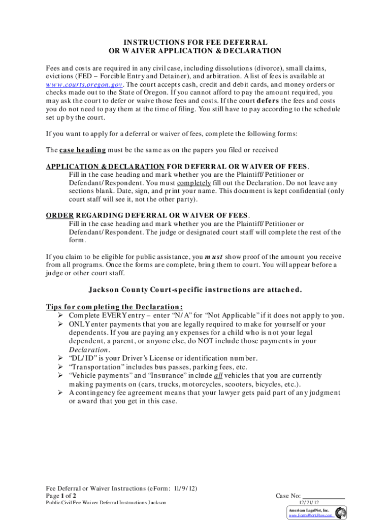 INSTRUCTIONS FOR FEE DEFERRAL OR WAIVER APPLICATION & DECLARATION Fees and costs are required in any civil case, including dissolution (divorce), small claims, evictions (FED Forcible Entry and Detained),