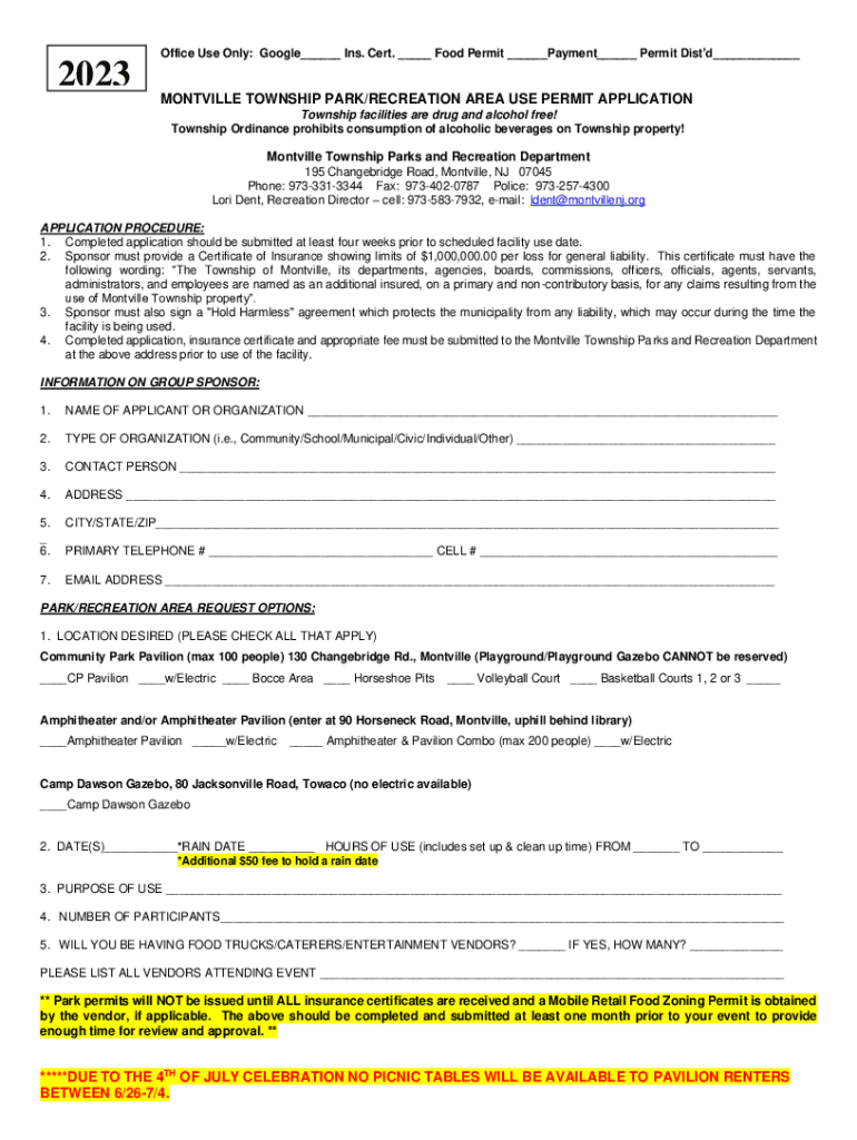2023 PARK/RECREATION AREA USE PERMIT APPLICATION PROCEDURE To inquire about park or recreation area availability, please email pgriffin@montvillenj.org or call 9733313358. To reserve a park or recreation