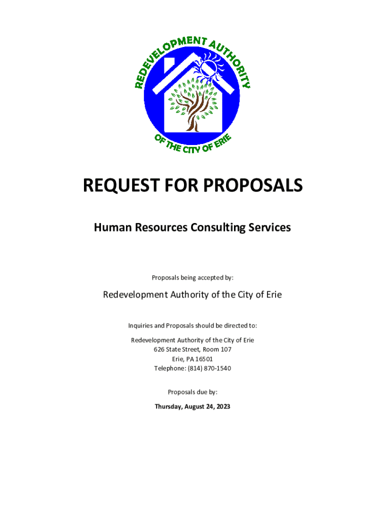 REQUEST FOR PROPOSALS Human Resources Consulting ServicesProposals being accepted by:Redevelopment Authority of the City of Erie Inquiries and Proposals should be directed to: Redevelopment Authority