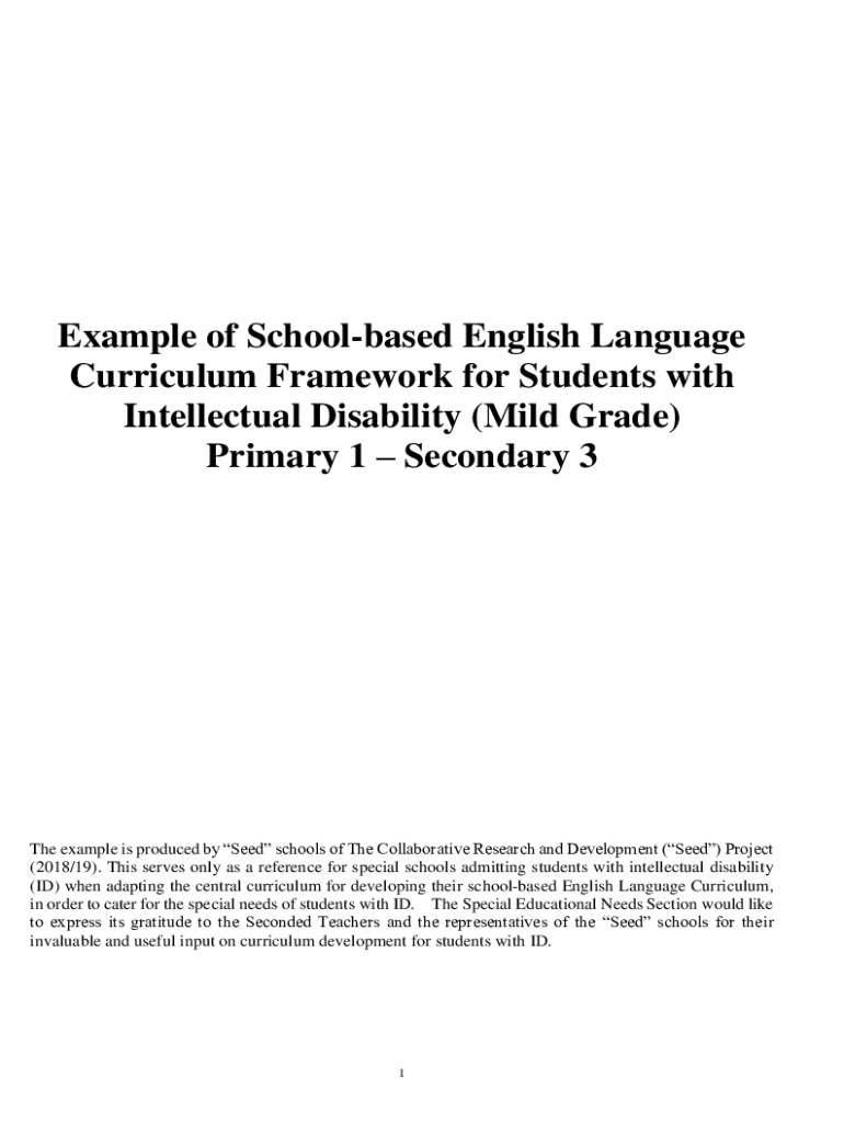 Example of School based English Language Curriculum Framework for Students with Intellectual Disability (Mild Grade) Primary 1 Secondary 3The example is produced by Seed schools of The Collaborative