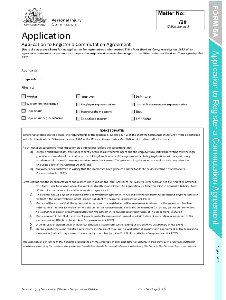 /20(Office use only)ApplicationFORM 5AMatter No:Application to Register a Commutation AgreementApplicant: