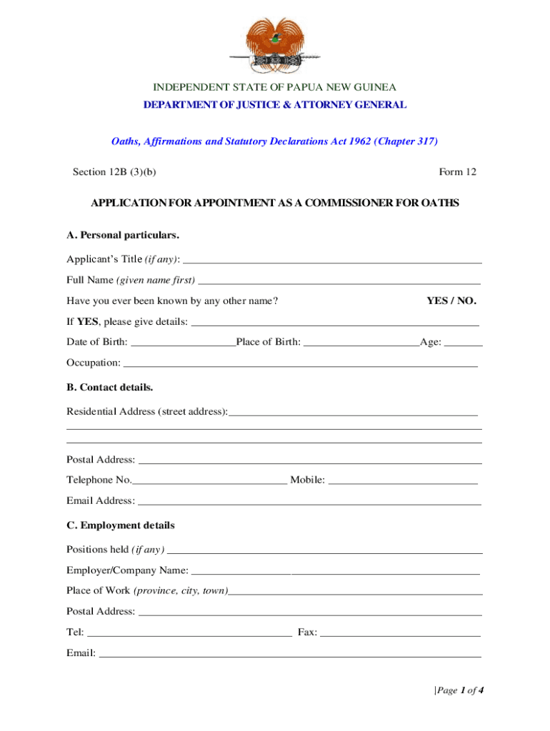INDEPENDENT STATE OF Papua New Guinea DEPARTMENT OF JUSTICE & ATTORNEY Generalists, Affirmations and Statutory Declarations Act 1962 (Chapter 317) Section 12B (3)(b)Form 12APPLICATION FOR APPOINTMENT