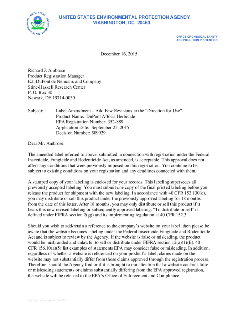 UNITED STATES ENVIRONMENTAL PROTECTION AGENCY WASHINGTON, DC 20460 OFFICE OF CHEMICAL SAFETY AND POLLUTION PREVENTION December 16, 2015Richard J. Ambrose Product Registration Manager E.I. DuPont de