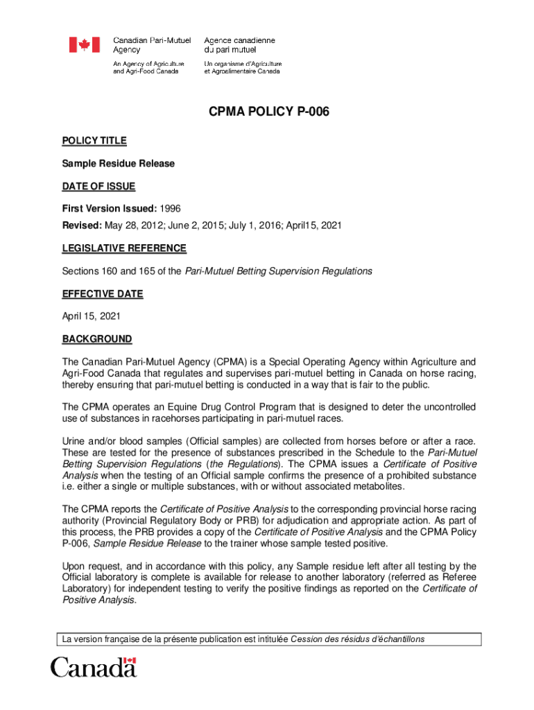 COMA POLICY P006 POLICY TITLE Sample Residue Release DATE OF ISSUE First Version Issued: 1996 Revised: May 28, 2012; June 2, 2015; July 1, 2016; April15, 2021 LEGISLATIVE REFERENCE Sections 160 and