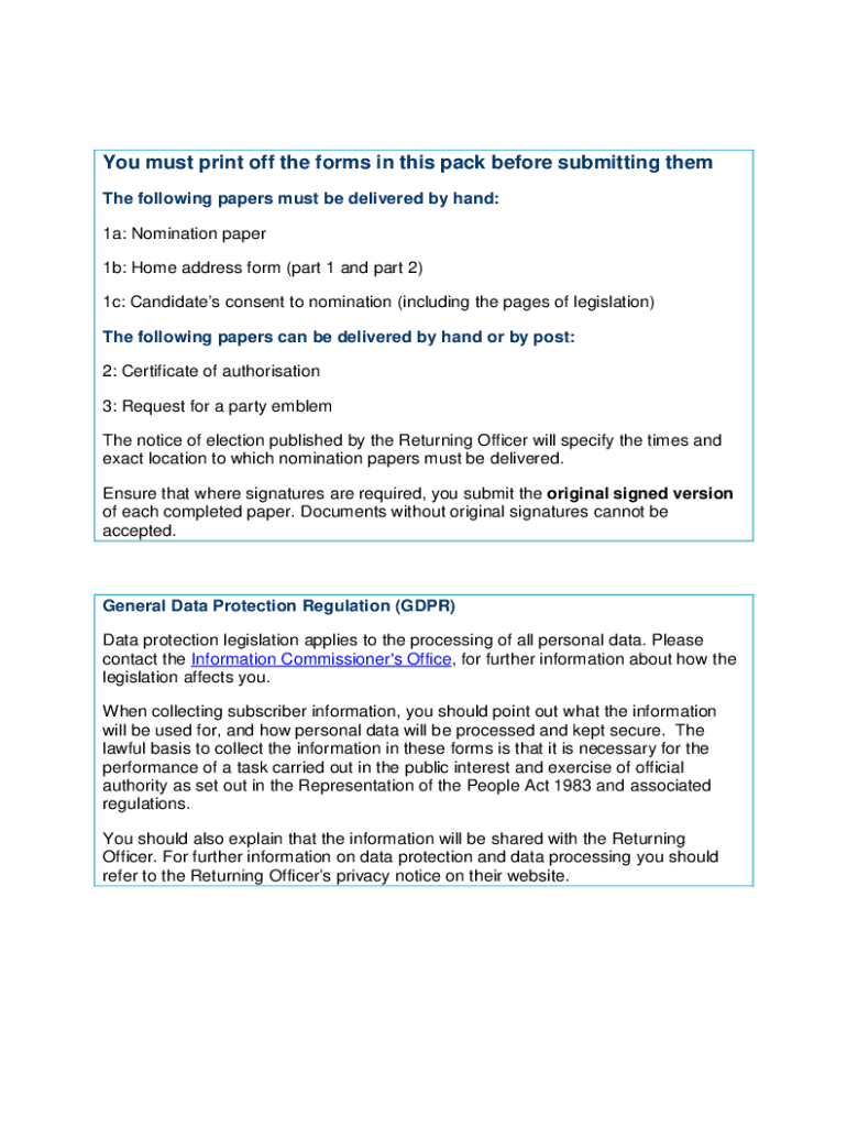 You must print off the forms in this pack before submitting them The following papers must be delivered by hand: 1a: Nomination paper 1b: Home address form (part 1 and part 2) 1c: Candidates consent