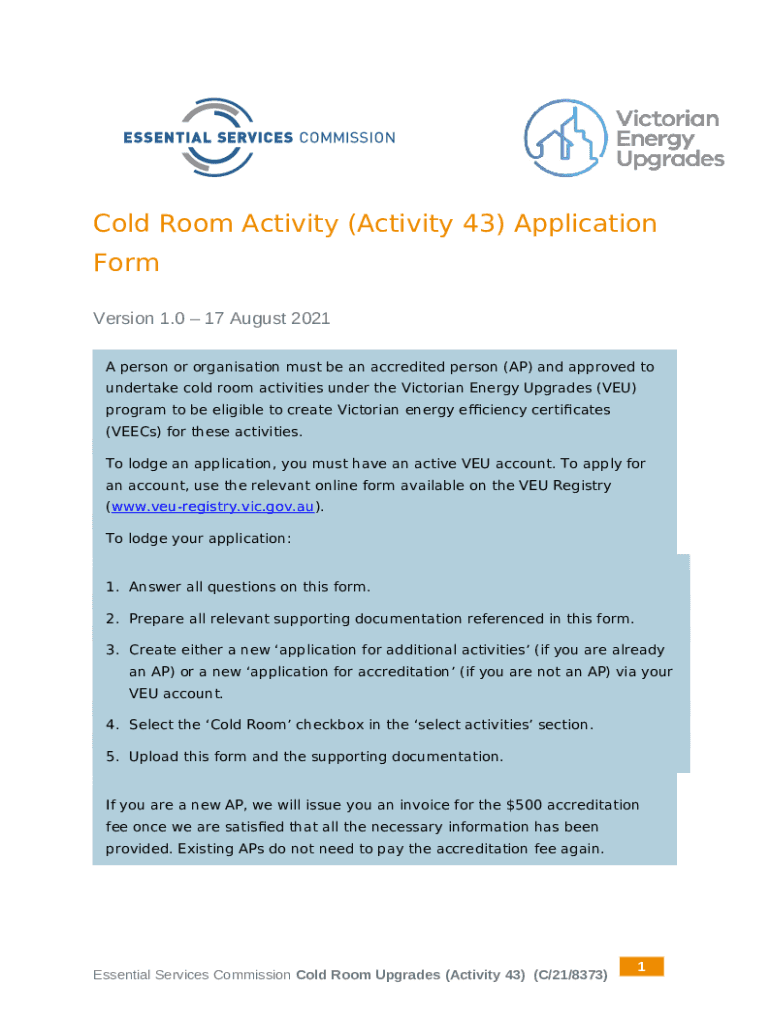 How should you fill out the Cold Room Activity (Activity 43) Application template