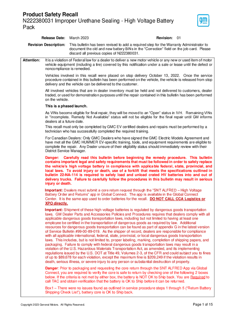 Get the free N222380031-03 - Safety Recall - High Voltage Battery Pack
