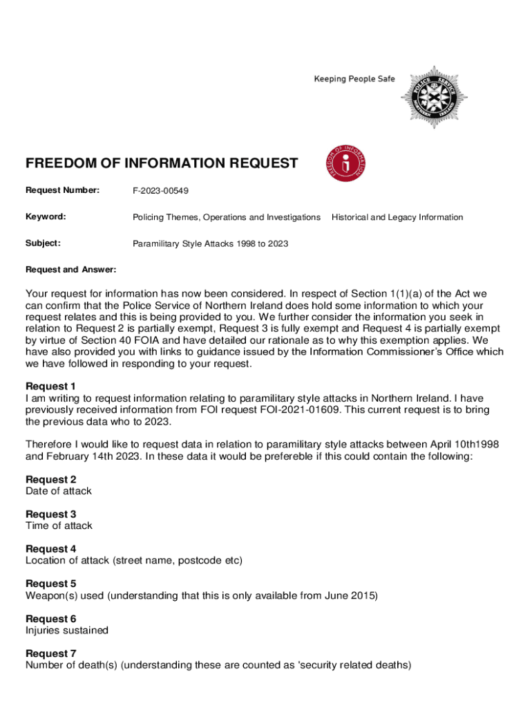 FREEDOM OF INFORMATION REQUEST Number:F202300549Keyword:Policing Themes, Operations and InvestigationsSubject:Paramilitary Style Attacks 1998 to 2023Historical and Legacy InformationRequest and Answer:Your