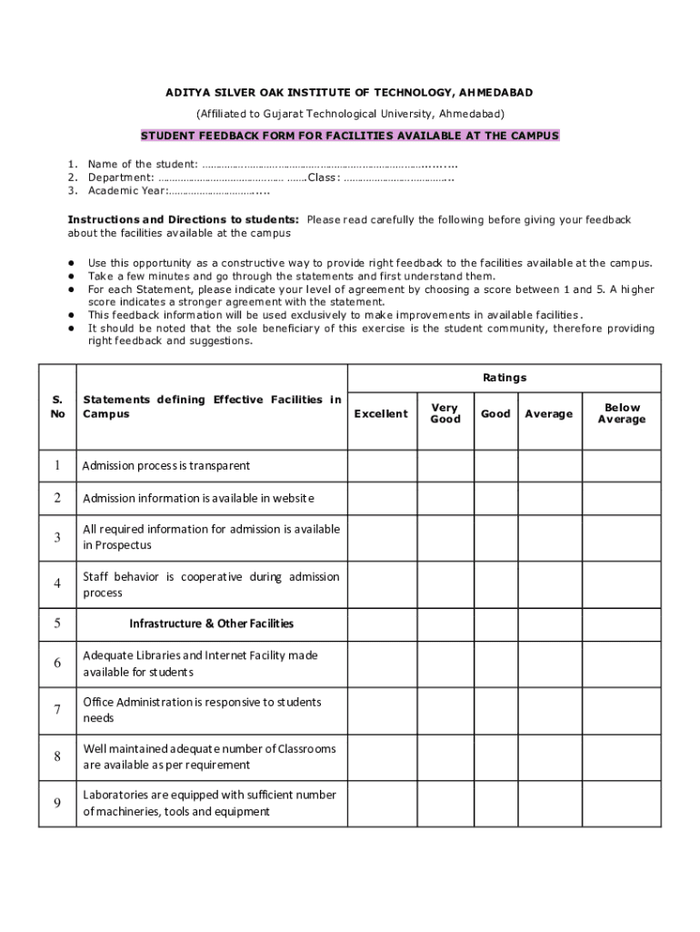 ADITYA SILVER OAK INSTITUTE OF TECHNOLOGY, AHMEDABAD (Affiliated to Gujarat Technological University, Ahmedabad) STUDENT FEEDBACK FORM FOR FACILITIES AVAILABLE AT THE CAMPUS 1. 2. 3. Name of the student: