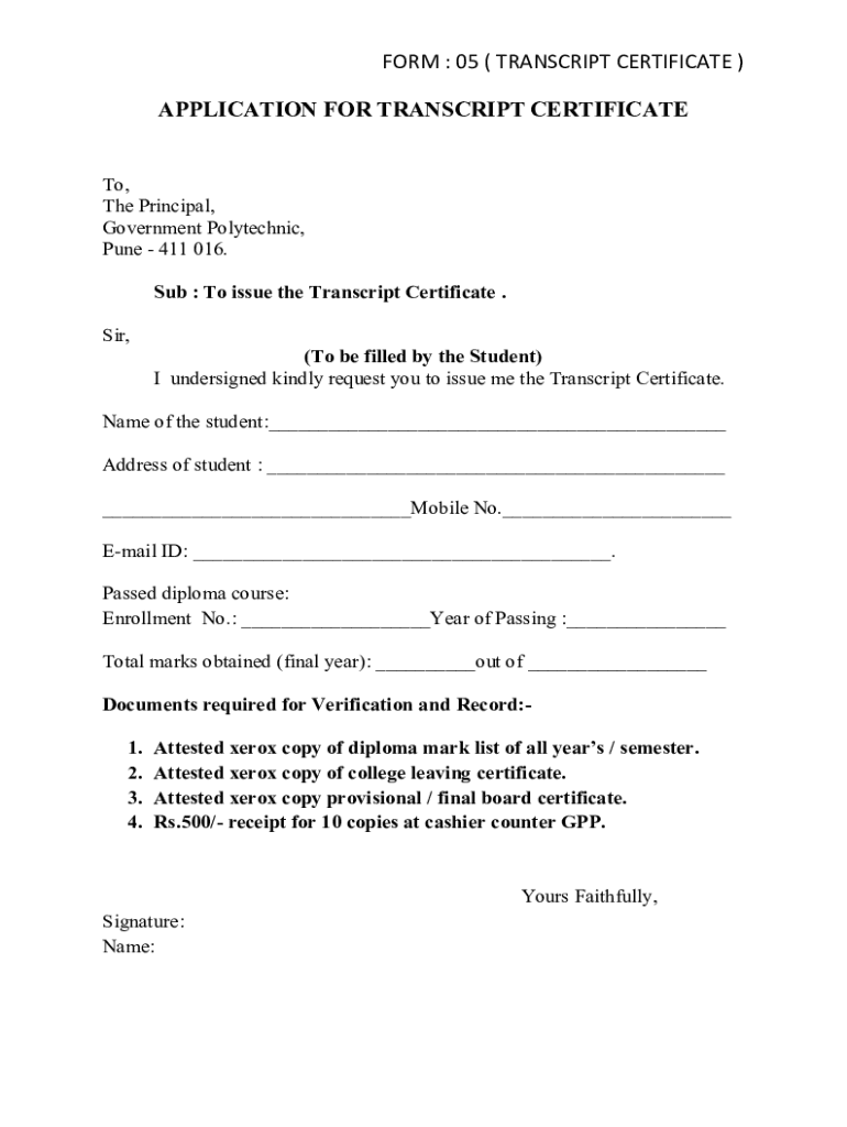 FORM : 05 (TRANSCRIPT CERTIFICATE) APPLICATION FOR TRANSCRIPT CERTIFICATE To, The Principal, Government Polytechnic, Pune 411 016. Sub : To issue the Transcript Certificate. Sir, (To be filled by