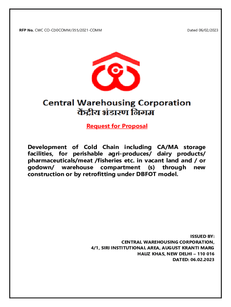 RFP No. CWC COCD0COMM/355/2021COMMDated 06/02/2023Request for Proposal Development of Cold Chain including CA/MA storage facilities, for perishable reproduces/ dairy products/ pharmaceuticals/meat