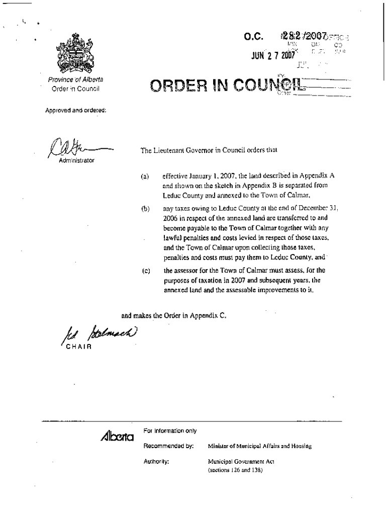 Province \'of Alberta Order in Council Approved and ordered:* Administrator Lieutenant Governor in Council orders that (a)effective January 1,2007, the land described in Appendix A and shown on the