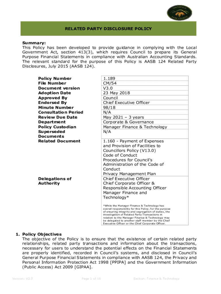 RELATED PARTY DISCLOSURE POLICY Summary: This Policy has been developed to provide guidance in complying with the Local Government Act, section 413(3), which requires Council to prepare its General