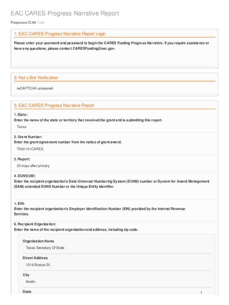 EAC CARES Progress Narrative Report Response ID:99 Data1. DAYCARES Progress Narrative Report Login Please enter your user word and password to begin the CARES Funding Progress Narrative. If you require