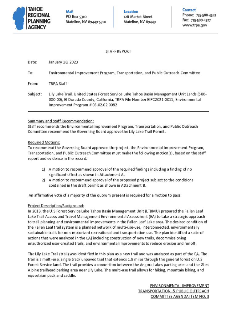 STAFF REPORT Date:January 18, 2023To:Environmental Improvement Program, Transportation, and Public Outreach CommitteeFrom:RPA StaffSubject:Lily Lake Trail, United States Forest Service Lake Tahoe