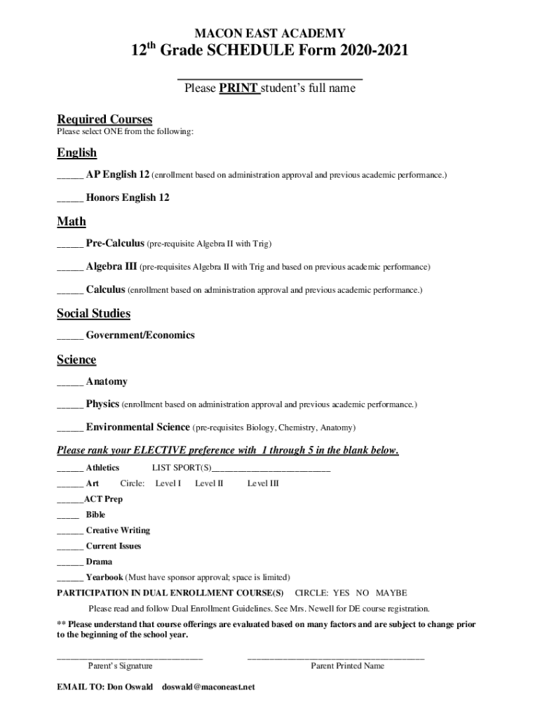 MACON EAST ACADEMY th12 Grade SCHEDULE Form 20202021 ___Please PRINT students full name Required Courses Please select ONE from the following:English ___ AP English 12 (enrollment based on administration