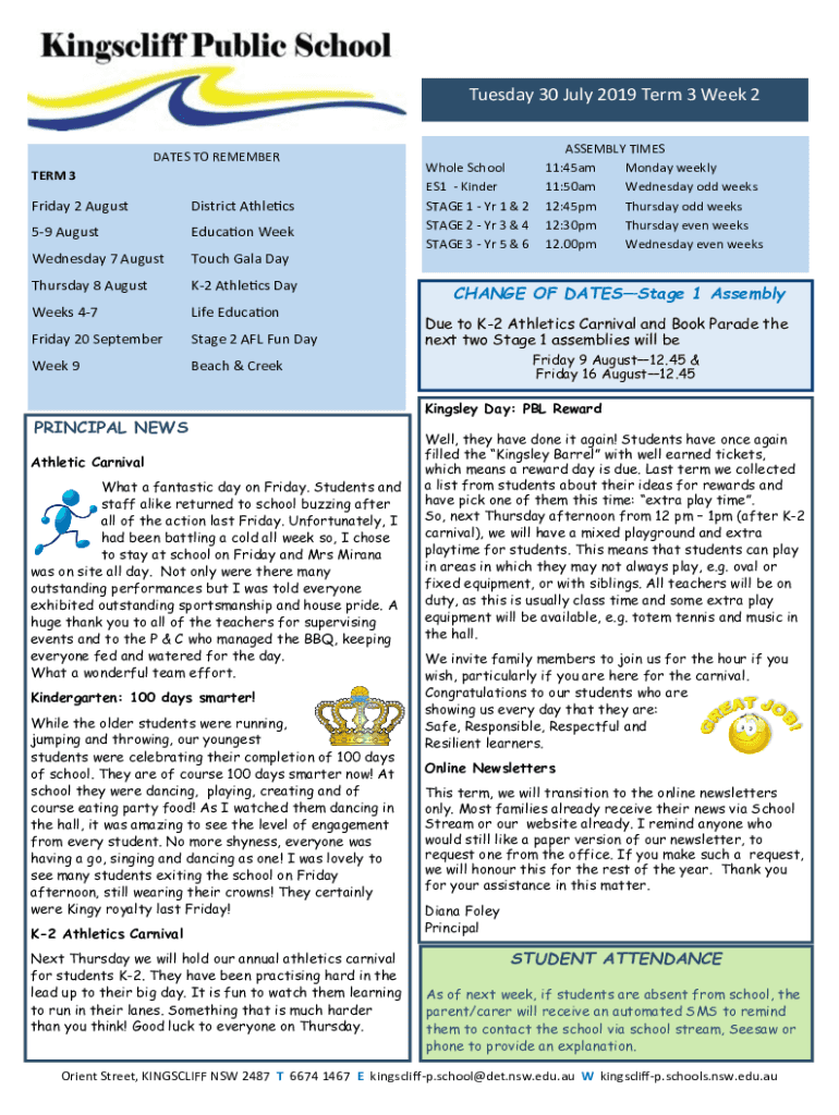 Tuesday 30 July 2019 Term 3 Week 2 DATES TO REMEMBER TERM 3Friday 2 AugustDistrict Athletics59 AugustEducation Week Wednesday 7 AugustTouch Gala Day Thursday 8 AugustK2 Athletics Day Weeks 47Life