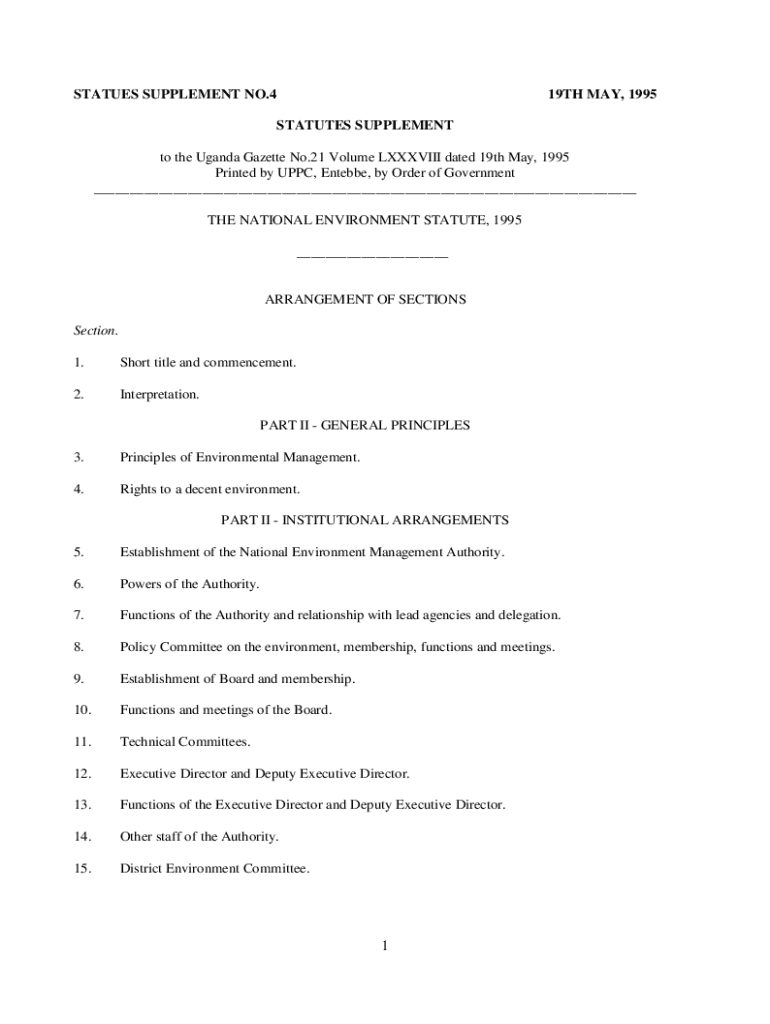 STATUES SUPPLEMENT NO.419TH MAY 1995 STATUTES SUPPLEMENT to the Uganda Gazette No.21 Volume XXXVIII dated 19th May 1995 Printed by UPC, Entente, by Order of Government ___ THE NATIONAL ENVIRONMENT