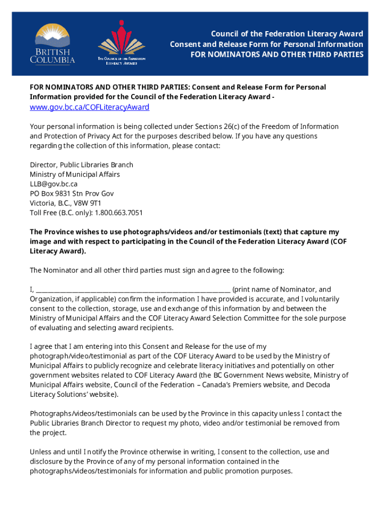 Council of the Federation Literacy Award Consent and Release Form for Personal Information FOR NOMINATORS AND OTHER THIRD PARTIES NOMINATORS AND OTHER THIRD PARTIES: Consent and Release Form for Personal