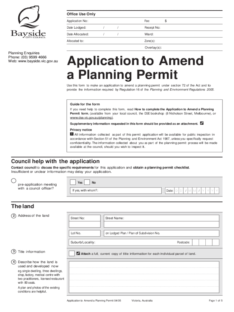Office Use Only Application No:Fee:Date Lodged://Receipt No:Date Allocated://Ward:Allocated to:zone(s): Overlay(s):Planning Inquiries Phone: (03) 9599 4666 Web: www.bayside.vic.gov.auApplication to