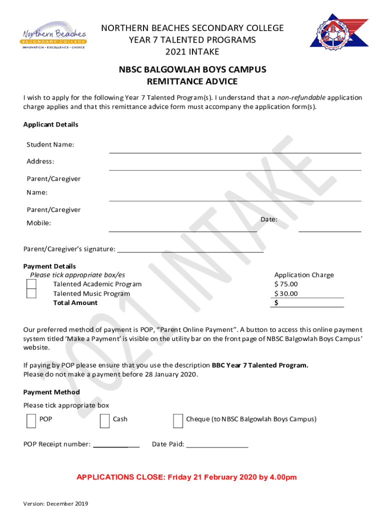 Get the free nbsc balgowlah boys campus remittance advice