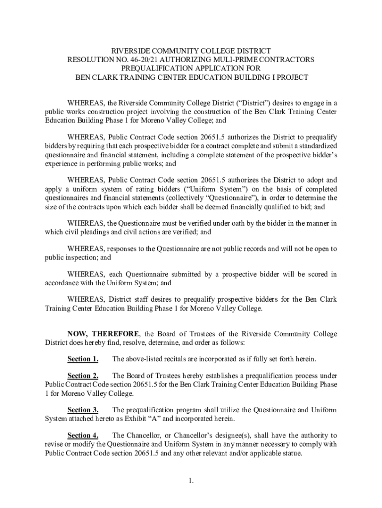 RIVERSIDE COMMUNITY COLLEGE DISTRICT RESOLUTION NO. 4620/21 AUTHORIZING SUBPRIME CONTRACTORS PREQUALIFICATION APPLICATION FOR BEN CLARK TRAINING CENTER EDUCATION BUILDING I PROJECT WHEREAS, the Riverside