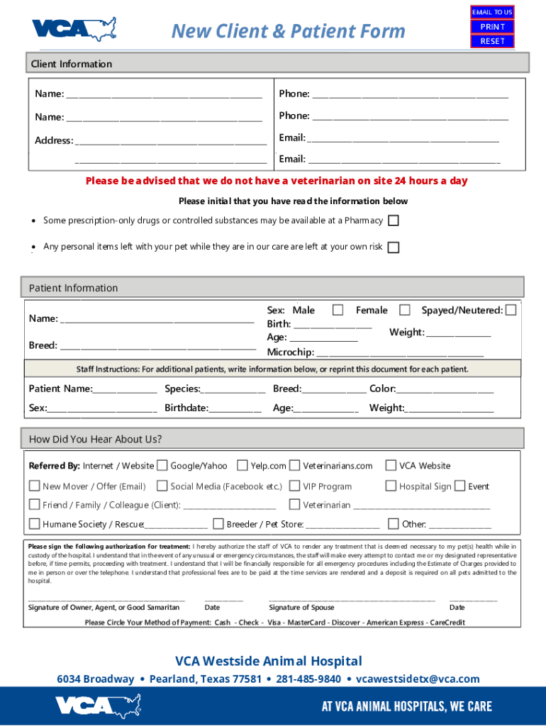 EMAIL TO New Client & Patient Footprint Resettlement Information Name: ___Phone: ___Name: ___Phone: ___Address: ___Email: ______Email: ___Please be advised that we do not have a veterinarian on site