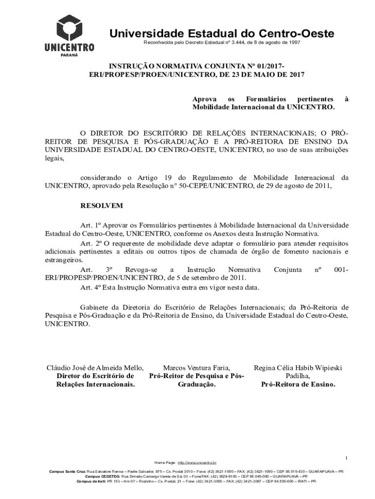 Reconhecida polo Secret Gradual n 3.444, DE 8 de Acosta de 1997INSTRUO NORMATIVE CONJUNCT N 01/2017ERI/PROP ESP/PROVEN/UNSCENTED, DE 23 DE MAI ODE 2017