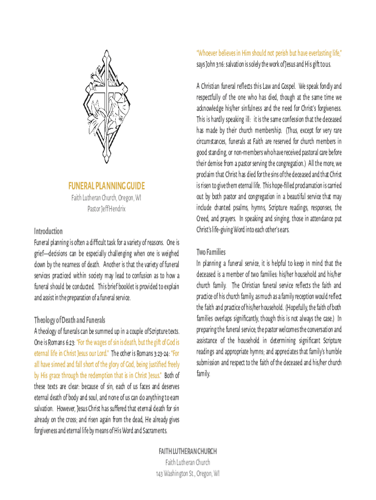 FUNERAL PLANNING GUIDE Faith Lutheran Church, Oregon, WI Pastor JE f HendrixIntroduction Funeral planning is o ten a DI cult task for a variety of reasons. One is grief decisions can be especially
