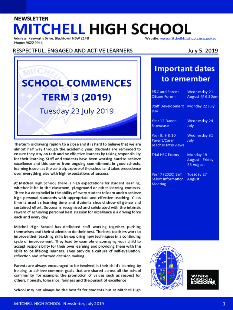 NEWSLETTERMITCHELL HIGH SCHOOL Address: Hayworth Drive, Blacktown NSW 2148Phone: 9622 9944Website: www.mitchellh.schools.nsw.gov.auRESPECTFUL, ENGAGED AND ACTIVE LEARNERS July 5, 2019Important dates
