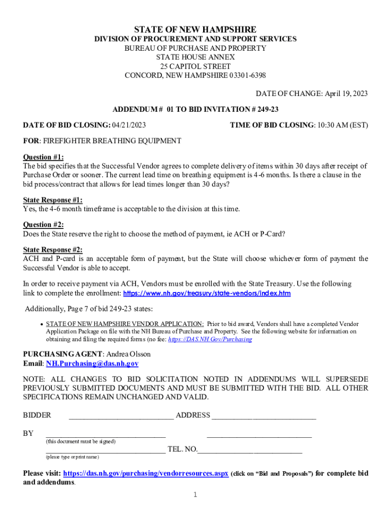 STATE OF NEW HAMPSHIREDIVISION OF PROCUREMENT AND SUPPORT SERVICES BUREAU OF PURCHASE AND PROPERTY STATE HOUSE ANNEX 25 CAPITOL STREET CONCORD, NEW HAMPSHIRE 033016398 DATE OF CHANGE: April 19, 2023,