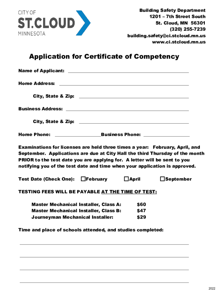 Building Safety Department 1201 7th Street South St. Cloud, MN 56301 (320) 2557239 building.safety@ci.stcloud.mn.us www.ci.stcloud.mn.usApplication for Certificate of Competency Name of Applicant:
