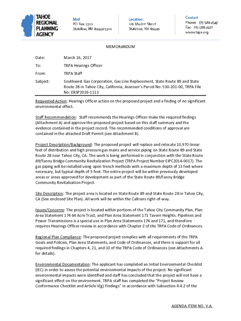 MEMORANDUM Date:March 16, 2017To:RPA Hearings OfficerFrom:RPA StaffSubject:Southwest Gas Corporation, Gas Line Replacement, State Route 89 and State Route 28 in Tahoe City, California, Assessors Parcel
