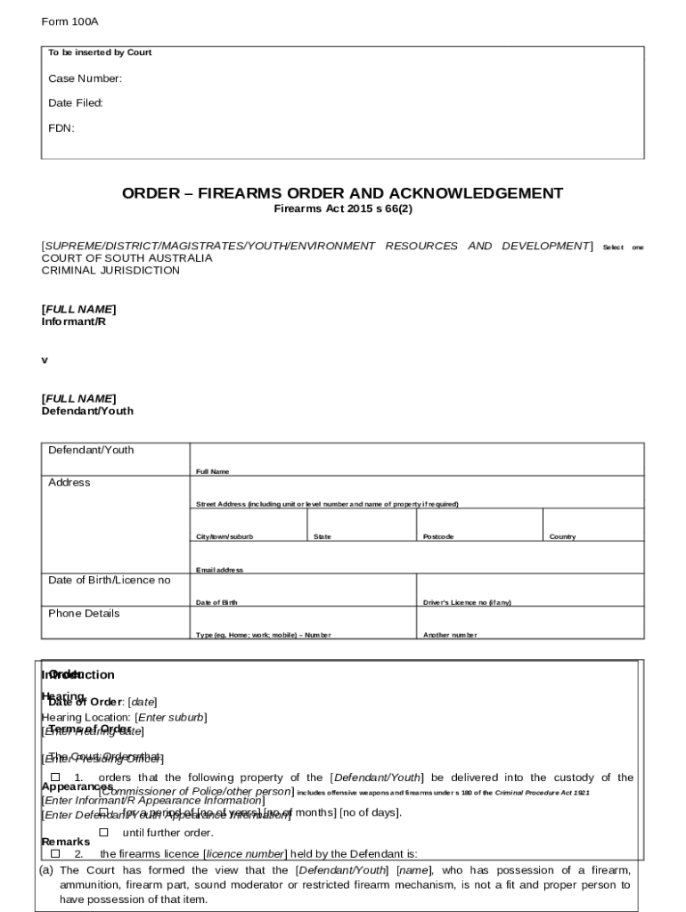 The 100A Order - Firearms Order and Acknowledgement is a fillable form in MS Word extension needed to be submitted to the specific address in order to provide specific info. It needs to be filled-out and signed, which is possible in hard copy, or by using a particular software e. g. PDFfiller. It allows to complete any PDF or Word document directly in your browser, customize it according to your purposes and put a legally-binding e-signature. Right after completion, you can easily send the 100A Order - Firearms Order and Acknowledgement to the appropriate individual, or multiple recipients via email or fax. The blank is printable as well thanks to PDFfiller feature and options proposed for printing out adjustment. In both digital and in hard copy, your form will have got neat and professional outlook. You may also turn it into a template to use it later, so you don't need to create a new blank form from scratch. All you need to do is to customize the ready template.