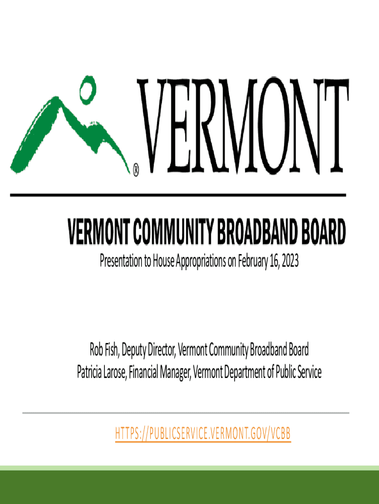 Presentation to House Appropriations on February 16, 2023Rob Fish, Deputy Director, Vermont Community Broadband Board Patricia Arose, Financial Manager, Vermont Department of Public Service HT T PS://PU