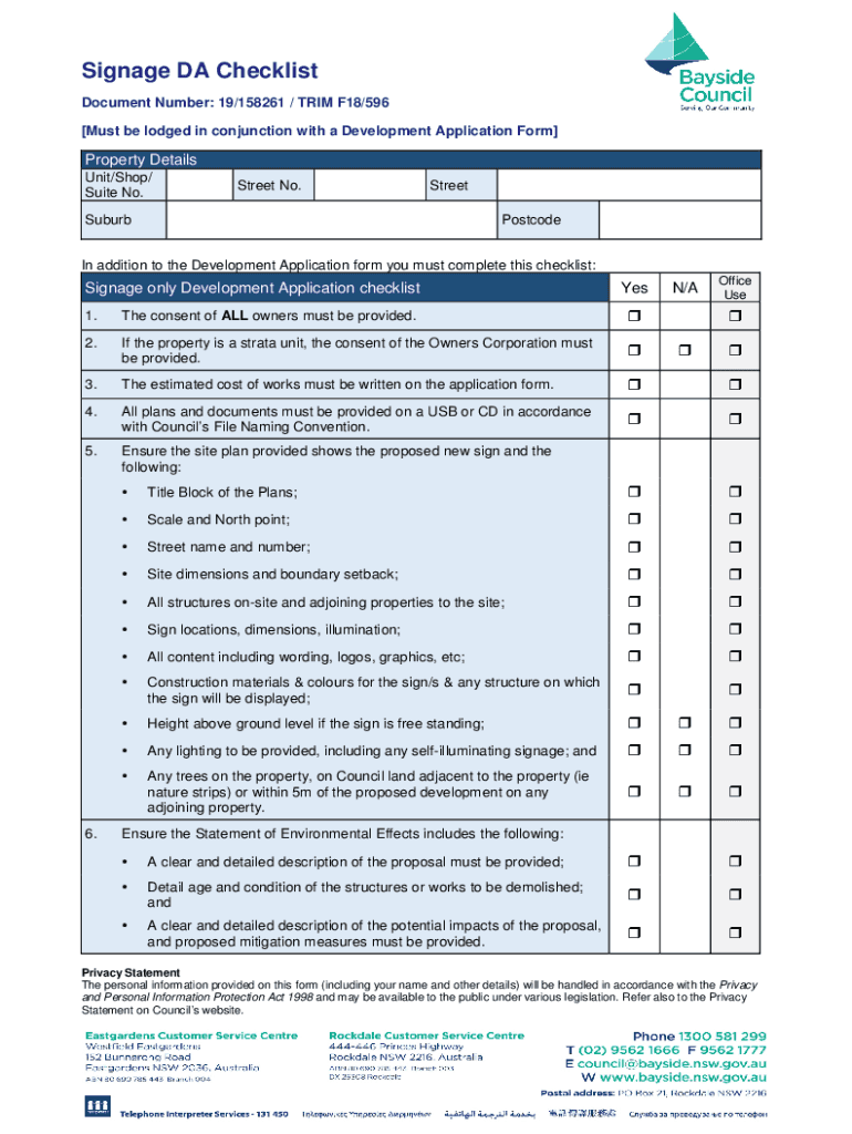 Signage DA Checklist Document Number: 19/158261 / TRIM F18/596 [Must be lodged in conjunction with a Development Application Form]Property Details Unit/Shop/ Suite No. Street No. StreetSuburbPostcodeIn