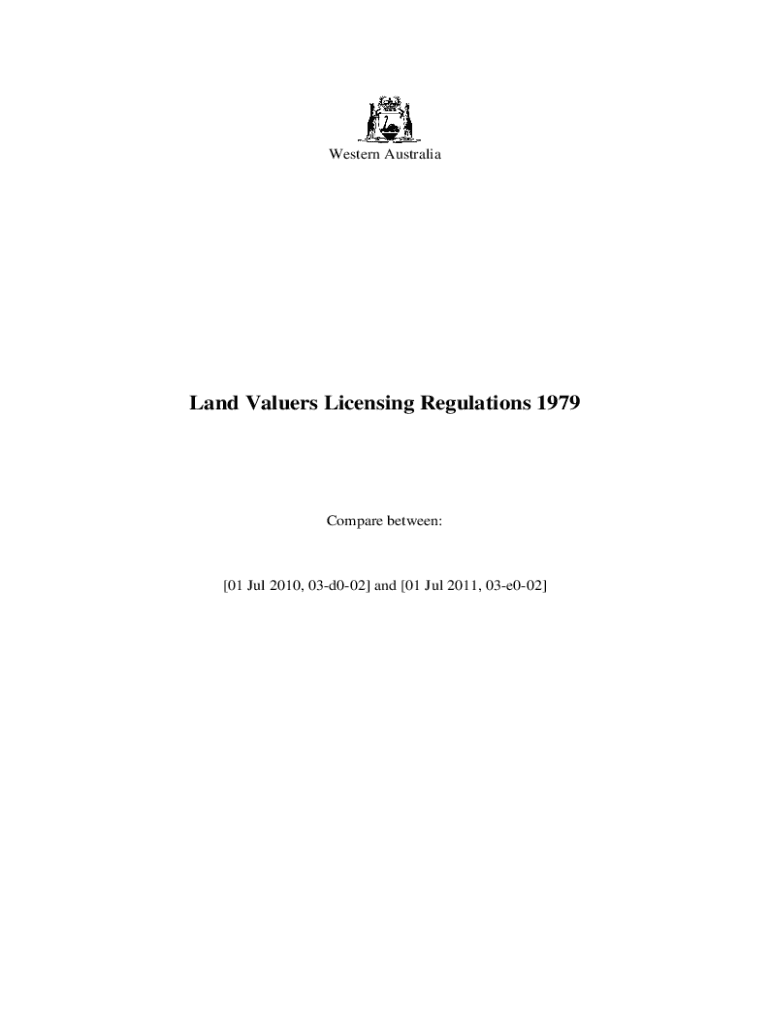 Western Australia Land Valuers Licensing Regulations 1979Compare between:[01 Jul 2010, 03d002] and [01 Jul 2011, 03e002]Western Australia Land Valuers Licensing Act 1978Land Valuers Licensing Regulations