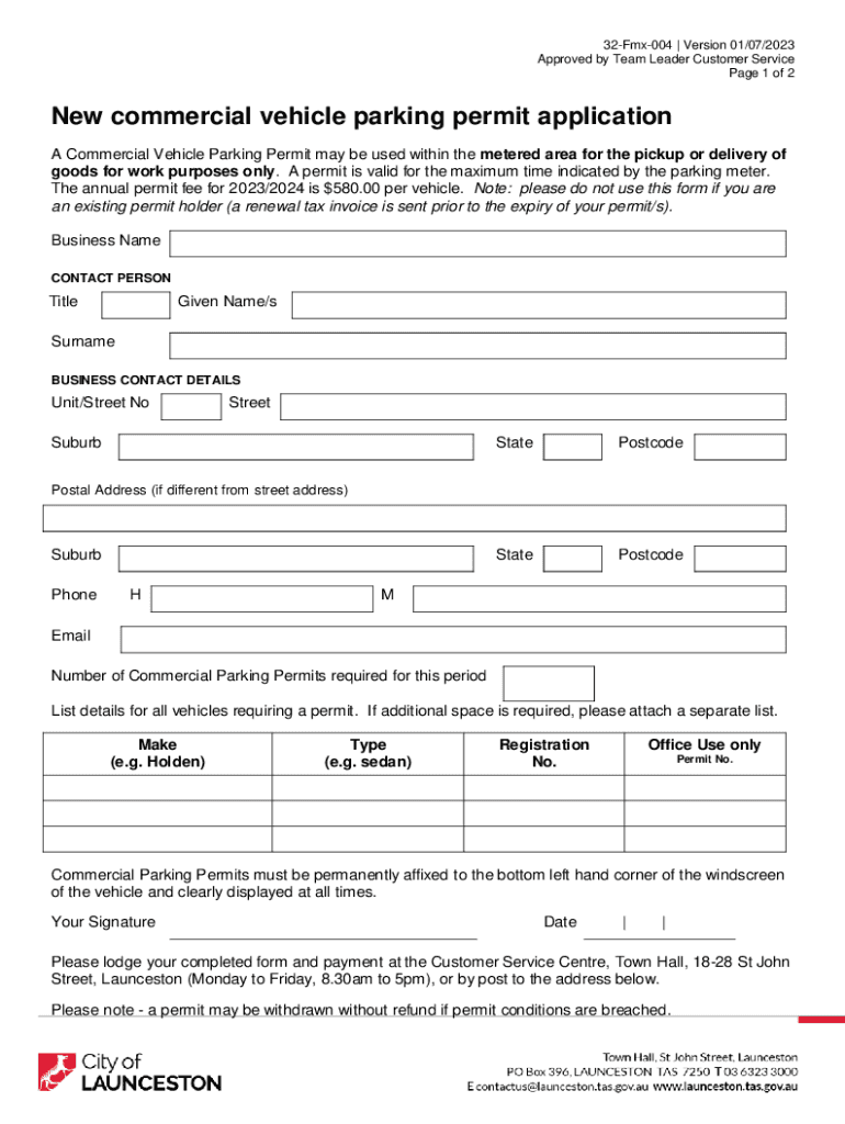 32Fmx004 | Version 01/07/2023 Approved by Team Leader Customer Service Page 1 of 2New commercial vehicle parking permit application A Commercial Vehicle Parking Permit may be used within the metered