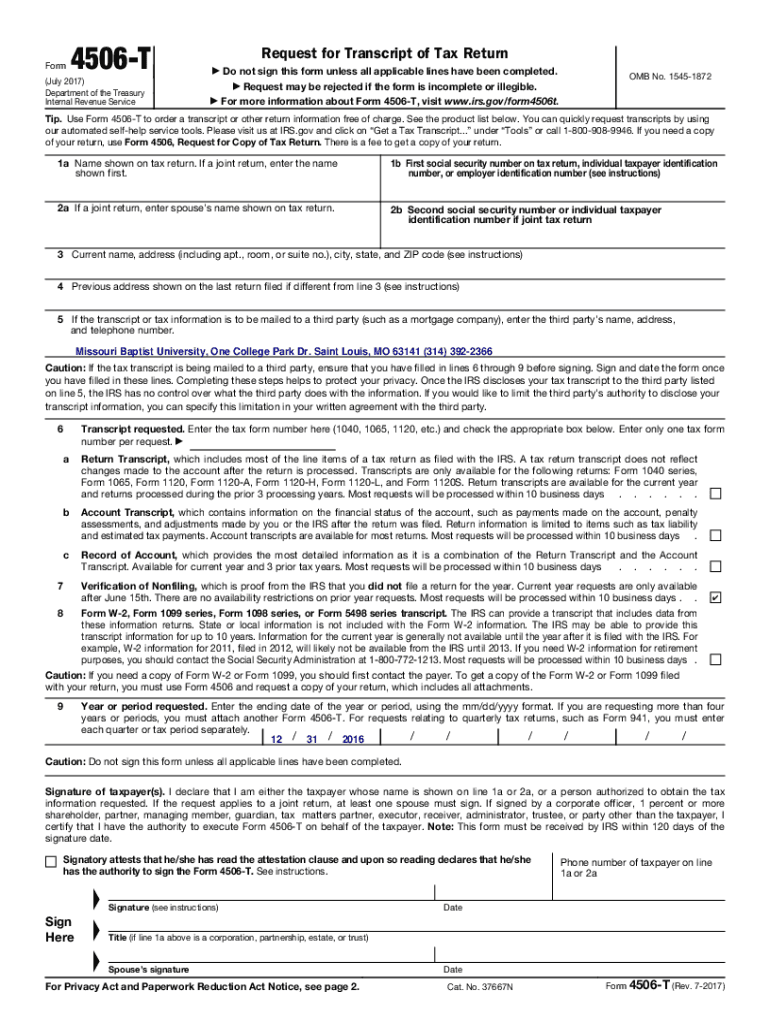 How to Request a Statement of Confining Complete the attached 4506T form that the Student Financial Services Office has started for you to request a statement of nonfiling from the IRS. Missouri Baptist