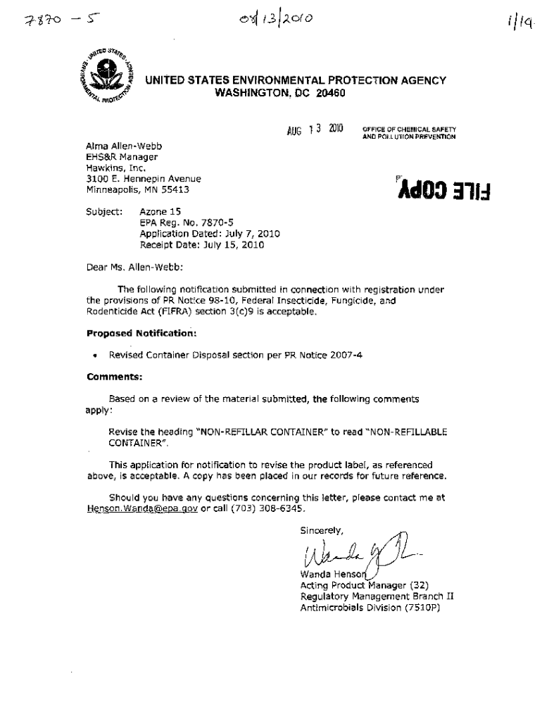 I /United STATES ENVIRONMENTAL PROTECTION AGENCY WASHINGTON, DC 20460AUG 1 3 2010 Alma Allen Webb ESR Manager Hawkins, Inc. 3100 E. Hennepin Avenue Minneapolis, MN 55413 Subject:OFFICE OF CHEMICAL