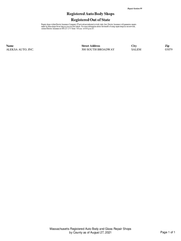 Name ALE KSA AUTO, INC. Street Address 500 SOUTH BROADWAYCity SALEMMassachusetts Registered Auto Body and Glass Repair Shops by County as of August 27, 2021Zip 03079Page 1 of 1